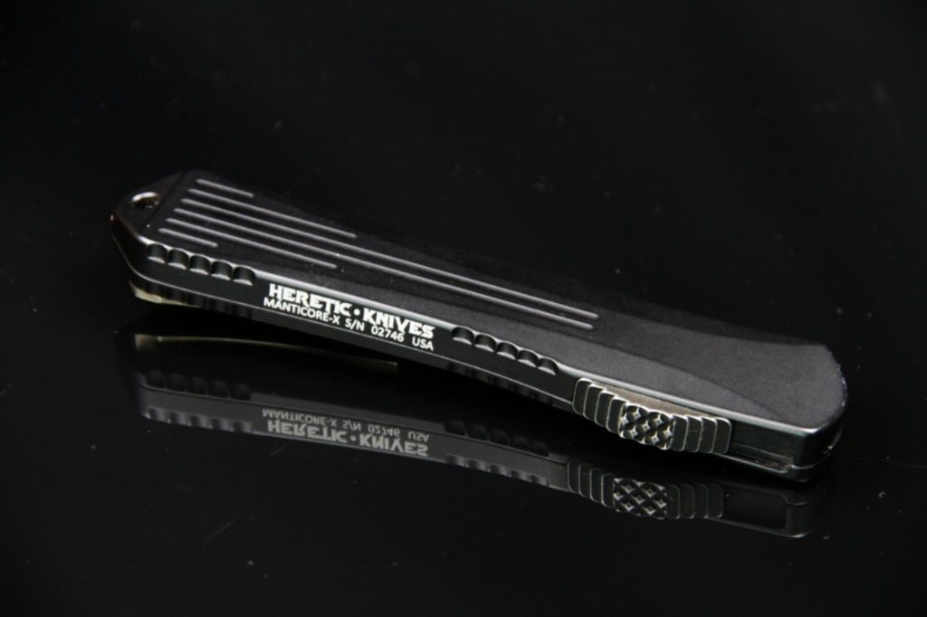 The Heretic Knives Manticore-X sets the standard for large, high-performance automatic knives. This double-action OTF (Out-The-Front) model is the flagship of the Manticore line, offering a substantial 3.7-inch blade (often in premium CPM Magnacut steel) and a total length of over 9 inches. Every Manticore-X is precision-engineered and made in the USA. The sleek, durable aluminum handle—often featuring the popular Grenade Grip texture—provides exceptional security. If you are looking for a powerful, full-size automatic knife with silky smooth action and a commitment to quality that rivals the best in the industry, the Manticore-X delivers the ultimate tactical and EDC experience. Backed by Heretic’s lifetime warranty.