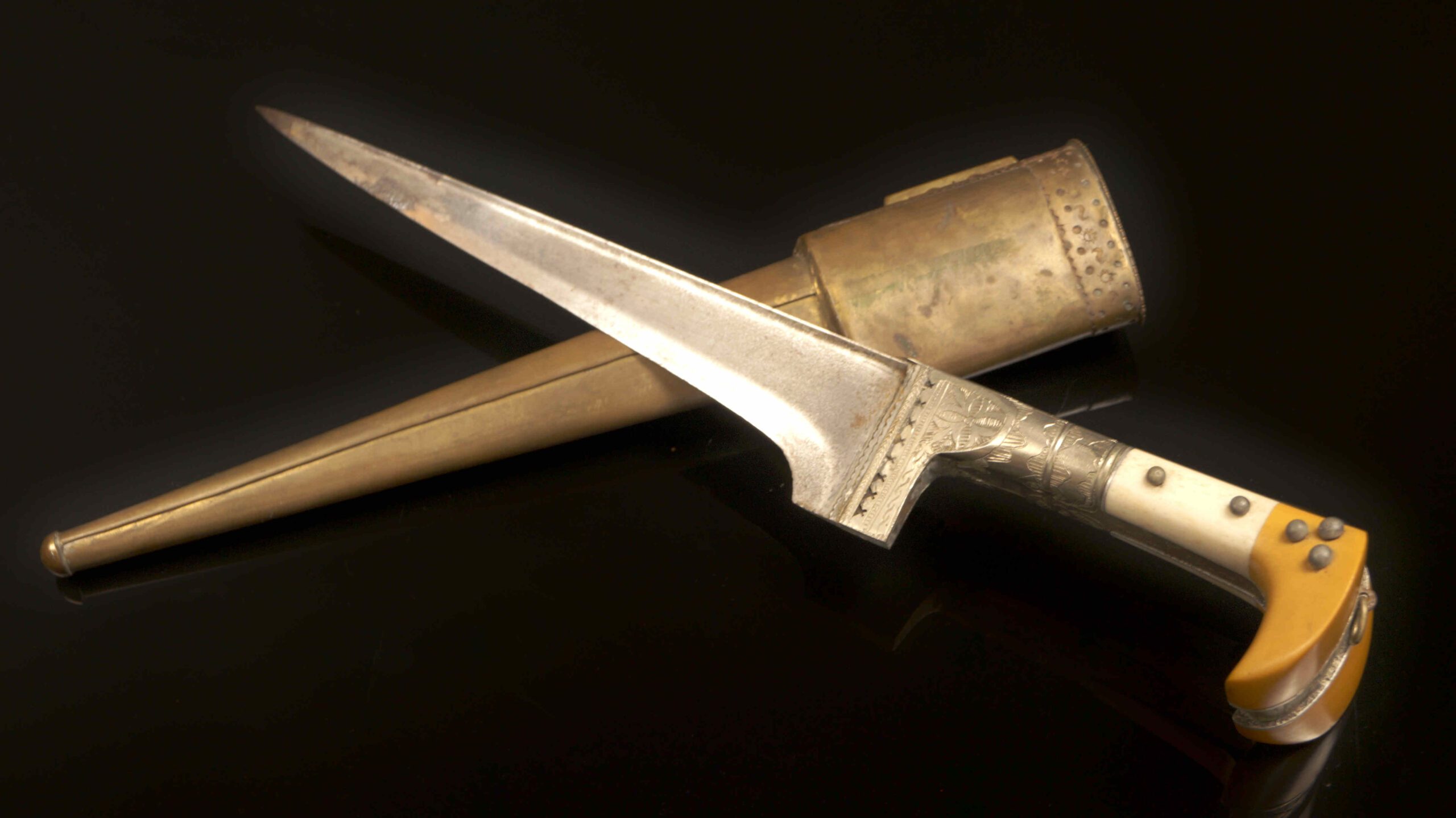 The Hilt Construction: The metal collar (bolster) between the blade and handle features hand-engraved floral and linear patterns. These were often made of a “white metal” alloy (similar to nickel-silver).