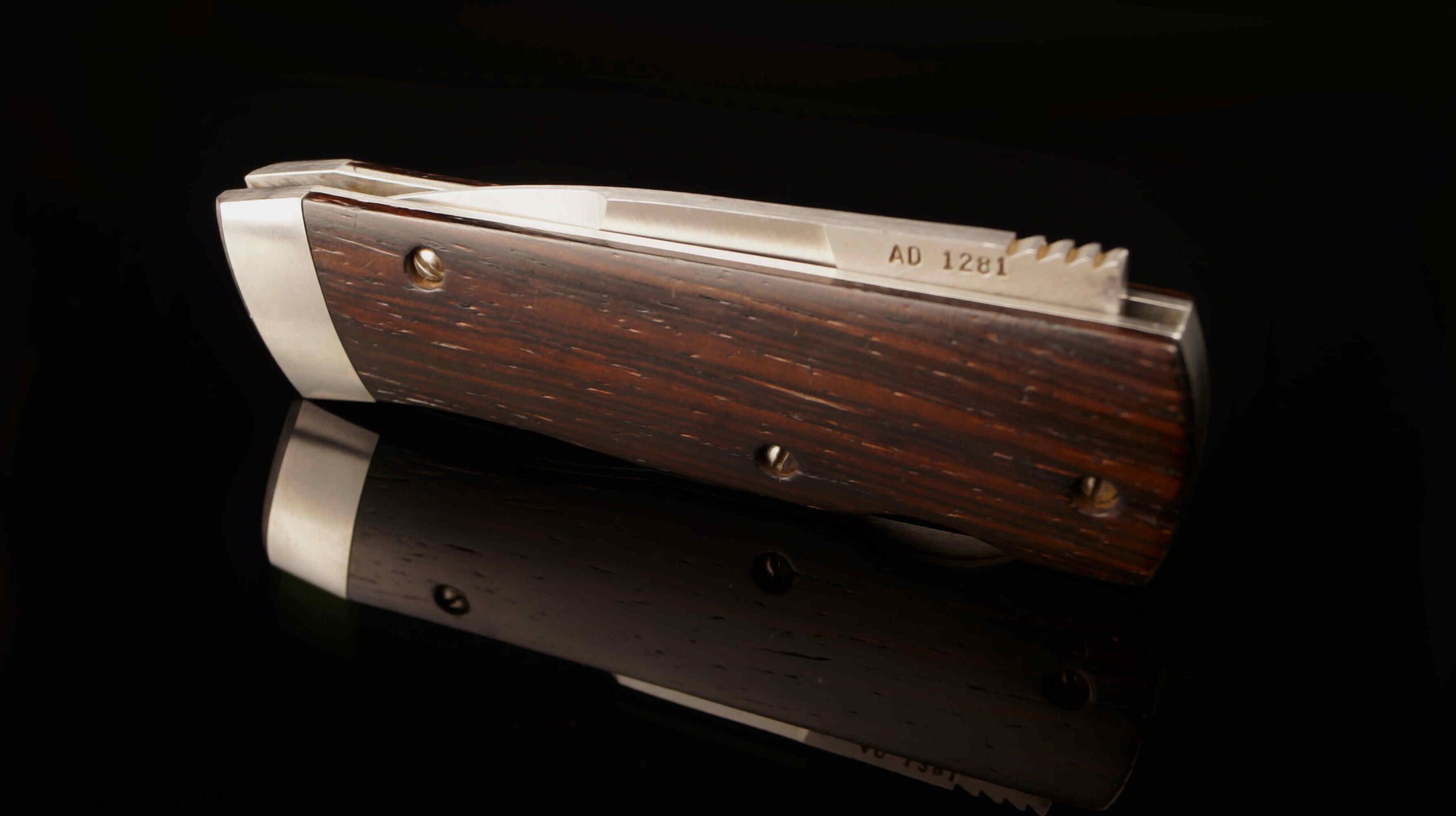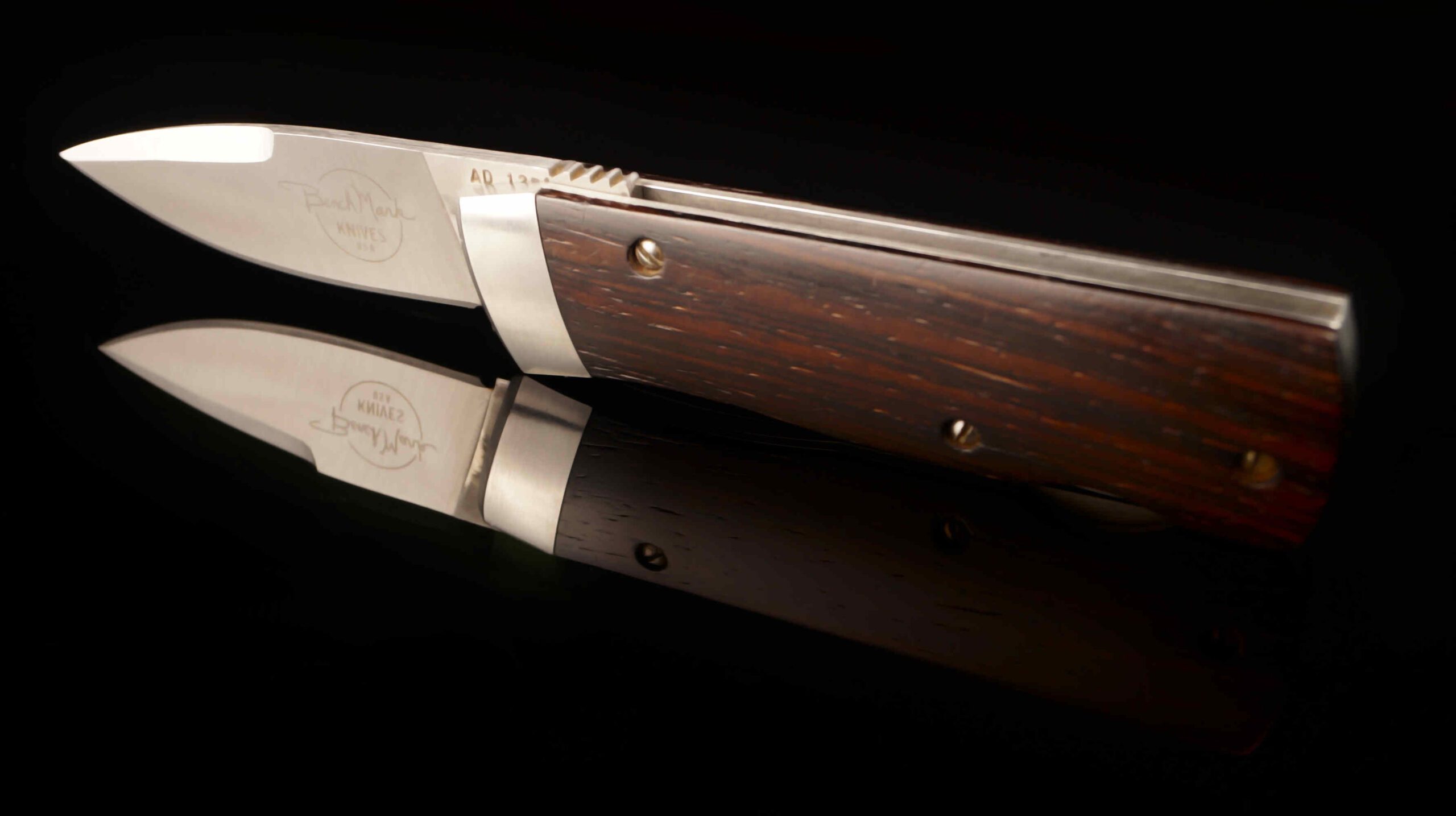 Barry Wood Design: This knife features the signature “swing-lock” or “swivel-frame” mechanism. Instead of a traditional folding hinge, the handle scales rotate around a pivot to reveal and lock the blade.