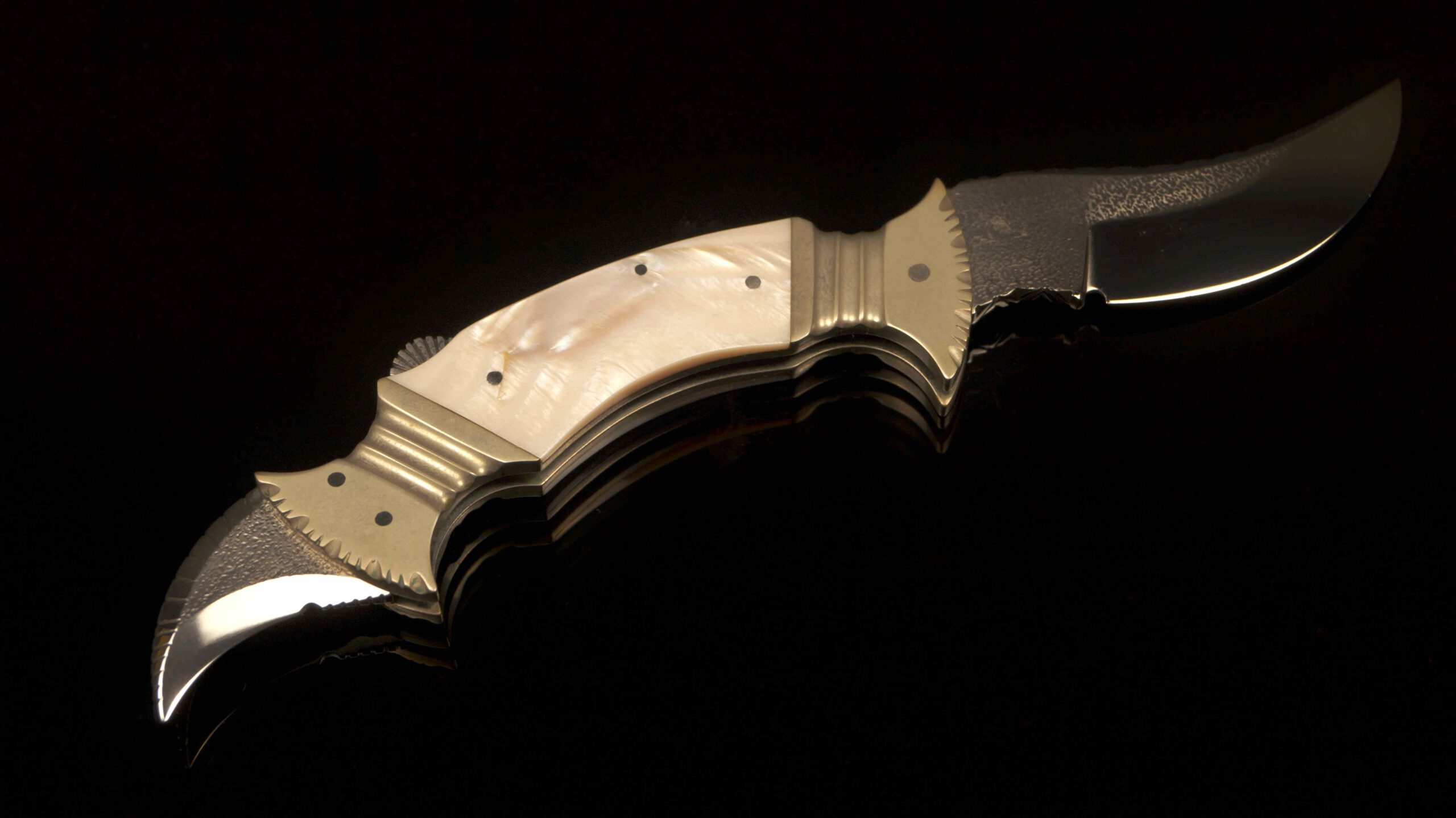The knife features a highly stylized, ergonomic curve characteristic of the karambit family but elevated with luxury materials and intricate metalwork.