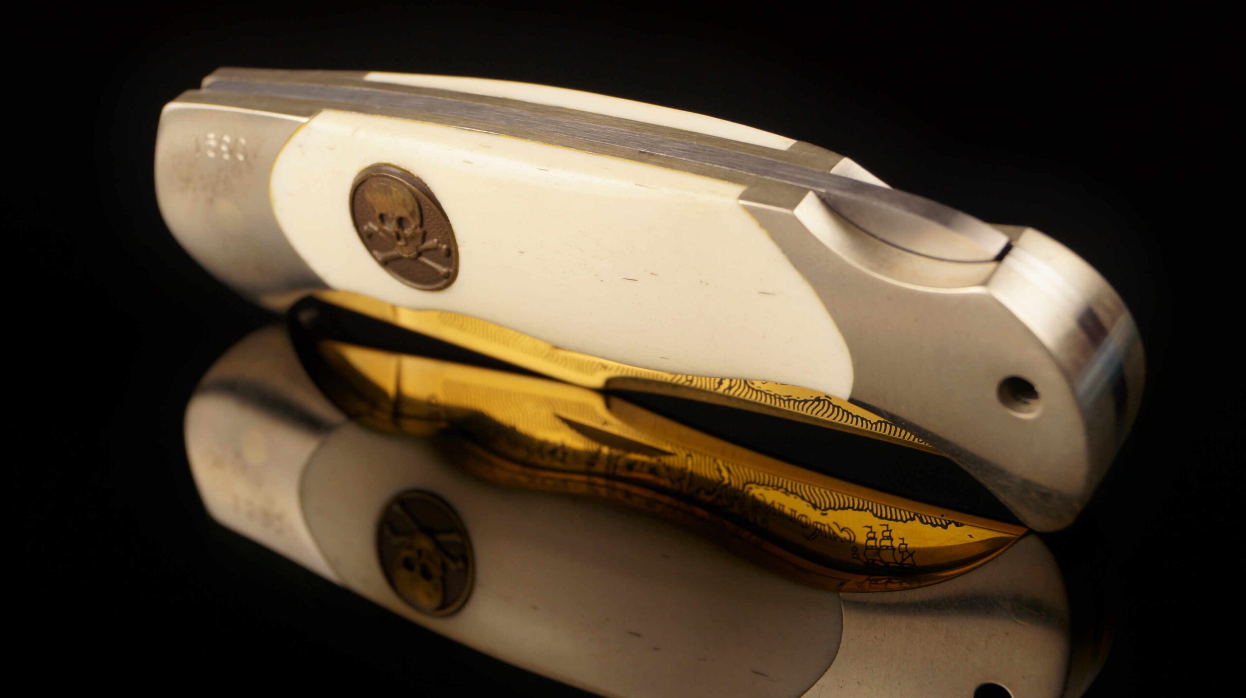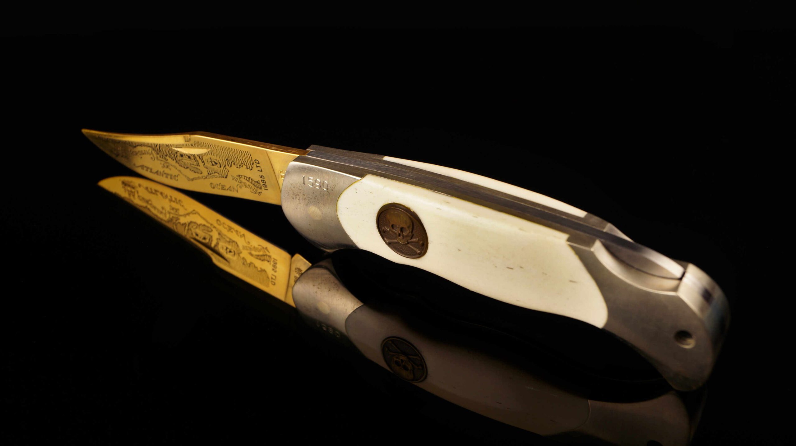 The contrast between the mirror-polished steel and the gold-washed engraving is striking, further enhanced by the smooth white bone handles. A bronze-finished Jolly Roger shield is expertly inlaid into the bone, adding a touch of seafaring grit to this elegant folder. Stamped with serial number 1590 and the 1985 LTD mark, this piece is a tangible slice of nautical history and mid-80s custom knife artistry.