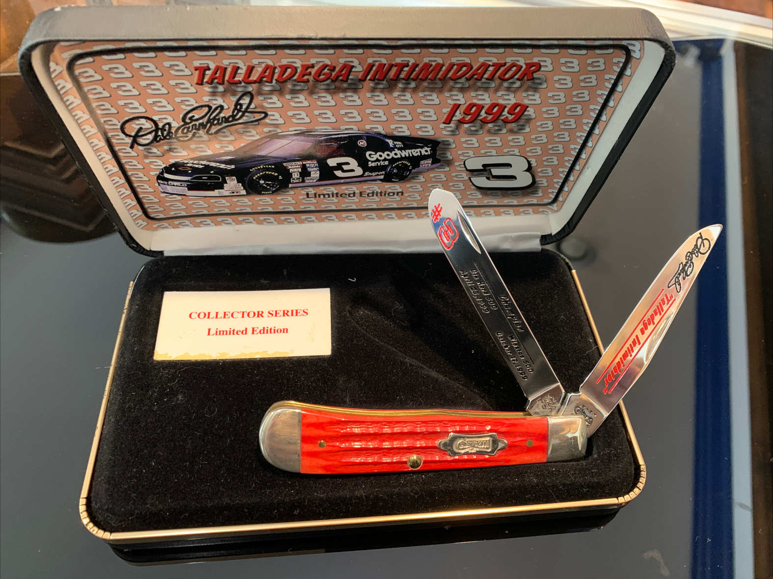 W. R. Case & Sons Cutlery Co., an iconic American brand founded in 1889, has a long history of producing high-quality knives. Known for their “Trapper” pattern—a classic folding knife with a clip and spey blade—Case has also partnered with various American icons to create commemorative pieces. The collaboration with Dale Earnhardt, a seven-time NASCAR Cup Series champion and one of the sport’s most legendary figures, created a highly sought-after series of knives. The 1999 edition is particularly notable as it was released during the height of Earnhardt’s career, making it a significant piece of racing history.