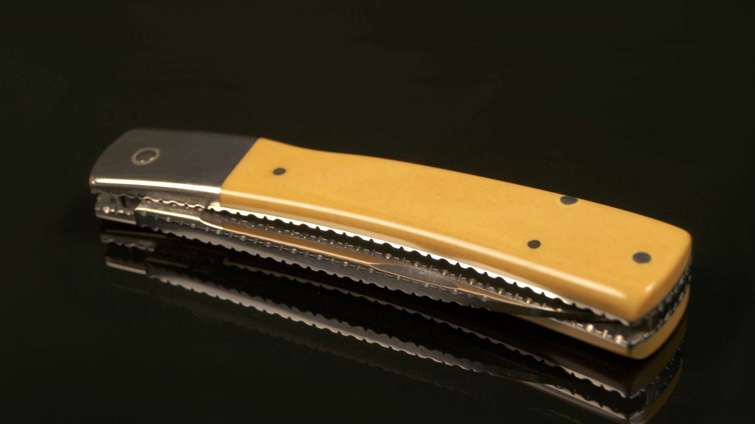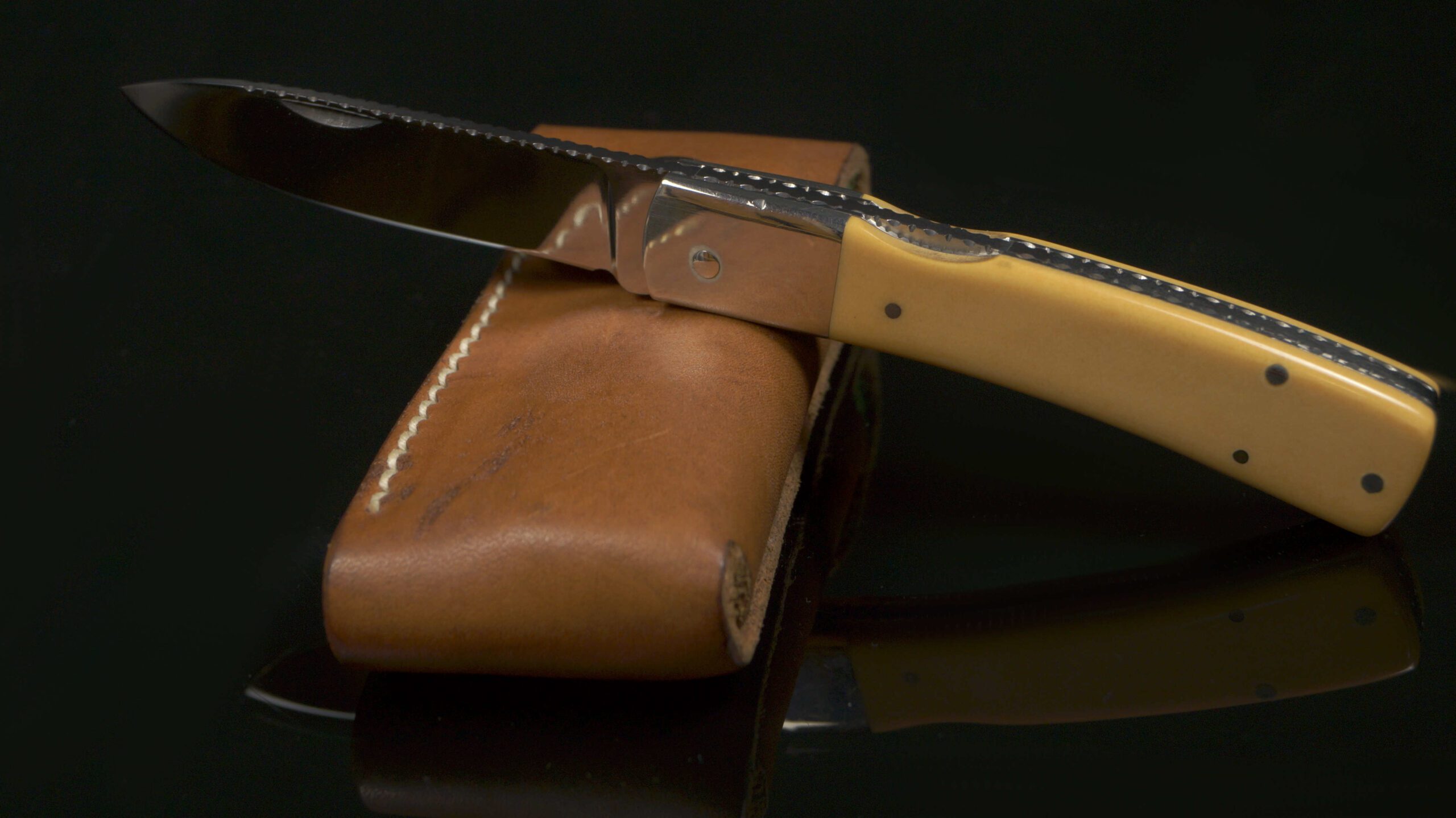 This lockback folder features a high polish blade, dovetailed nickel silver bolsters, and elephant ivory scales. File work on blade spine and backspacer.
