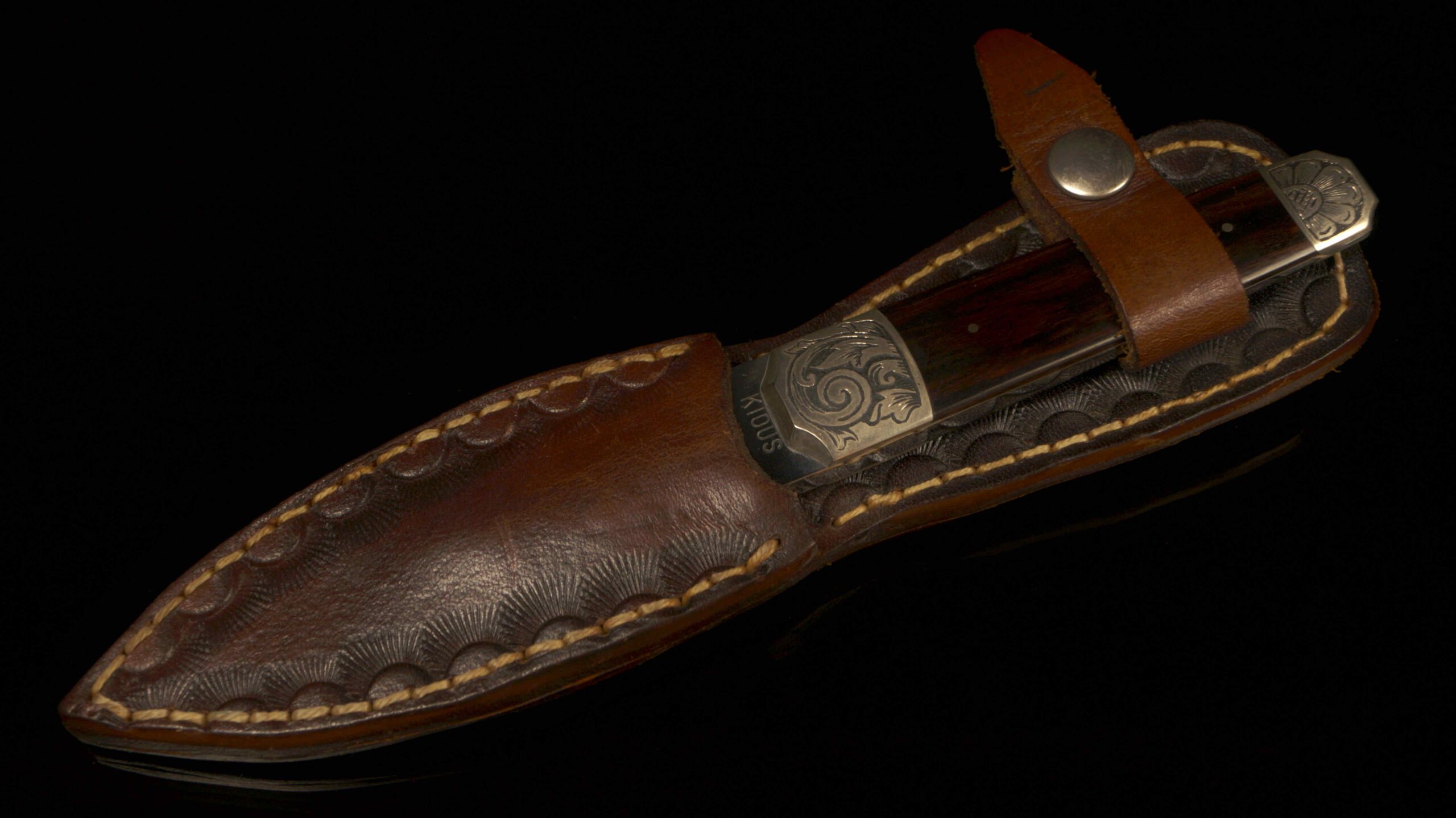 Elevate your collection with this exquisite Joe Kious Custom Boot Knife, a masterclass in functional art from one of the most respected names in the knife-making world. This fixed-blade dagger features a precision-ground, mirror-polished spear point blade that perfectly complements its rich, dark hardwood handle. The true standout of this piece is the intricate hand-engraved scrollwork on the silver-toned bolsters and pommel cap, showcasing the late Master Smith’s legendary attention to detail. Paired with a robust, hand-tooled leather sheath featuring decorative scalloped edges and a secure snap closure, this knife isn’t just a tool—it’s a legacy piece for the discerning enthusiast. Whether you are a fan of high-end tactical daggers or fine art knives, this Joe Kious original represents the pinnacle of American custom cutlery.