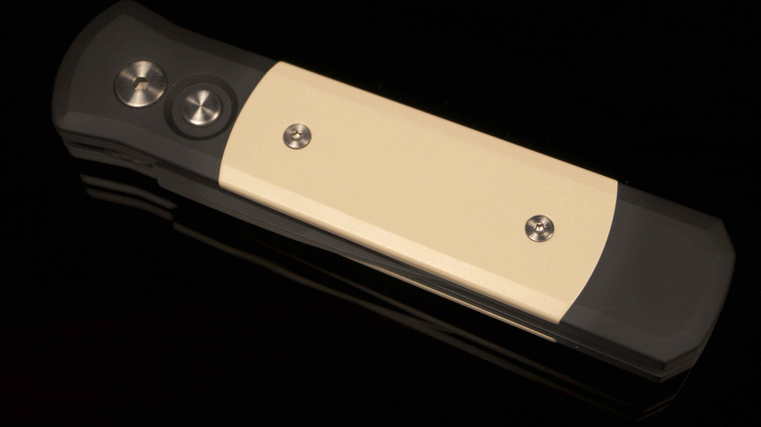 • The Look: It features a black anodized 6061-T6 aluminum frame paired with polished Ivory Micarta inlays.
