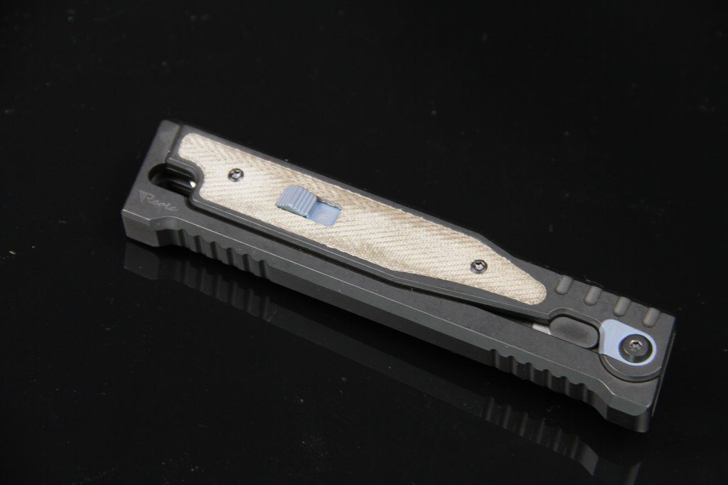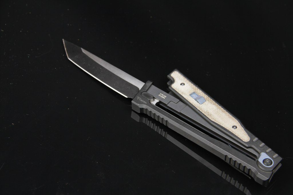 The Reate EXO Exoskeleton Gravity Knife features a double-edge Bohler Elmax blade with a stealthy black PVD finish, housed in a titanium exoskeleton frame with black Micarta inlays. This manual gravity knife deploys smoothly with a controlled tip action, offering a unique blend of precision, durability, and bold design — perfect for collectors and serious EDC enthusiasts.