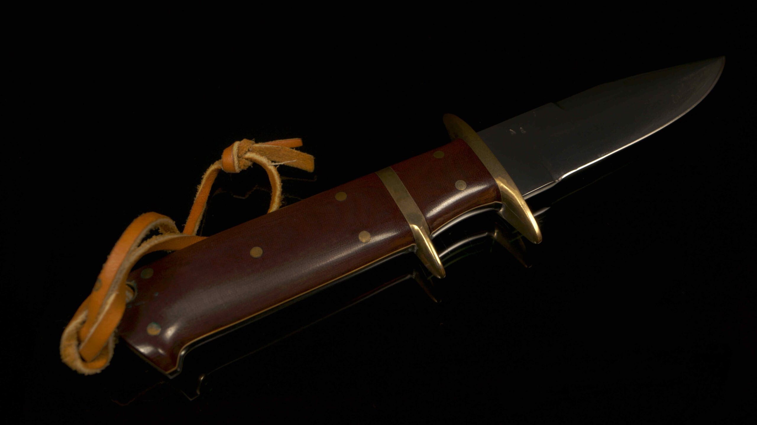 Crafted by Enedino De Leon, this Sub-Hilt Fighter is in excellent condition. It features a double-edged blade (.145″ stock, 1.071″ depth) with full tang construction. The handle is detailed with brass for the guard, sub-hilt, and pins, and fitted with canvas micarta scales. Original leather sheath with a belt loop is included.