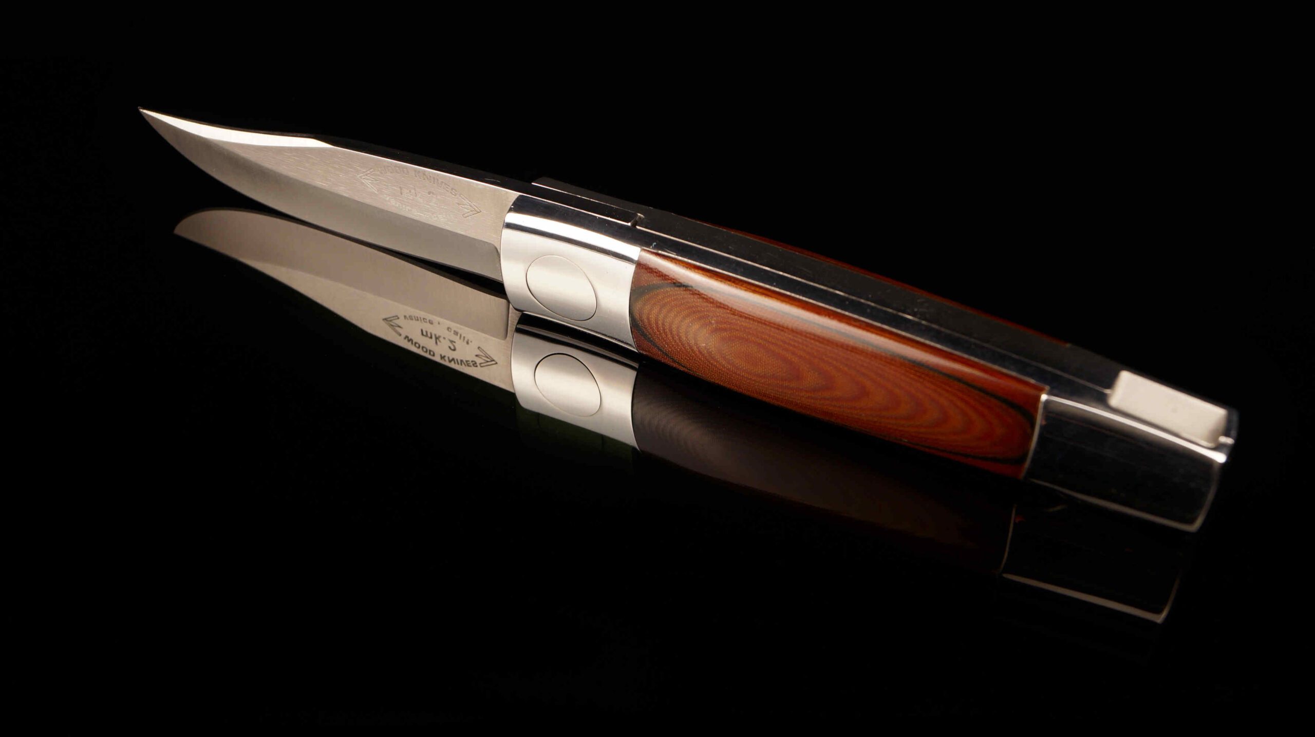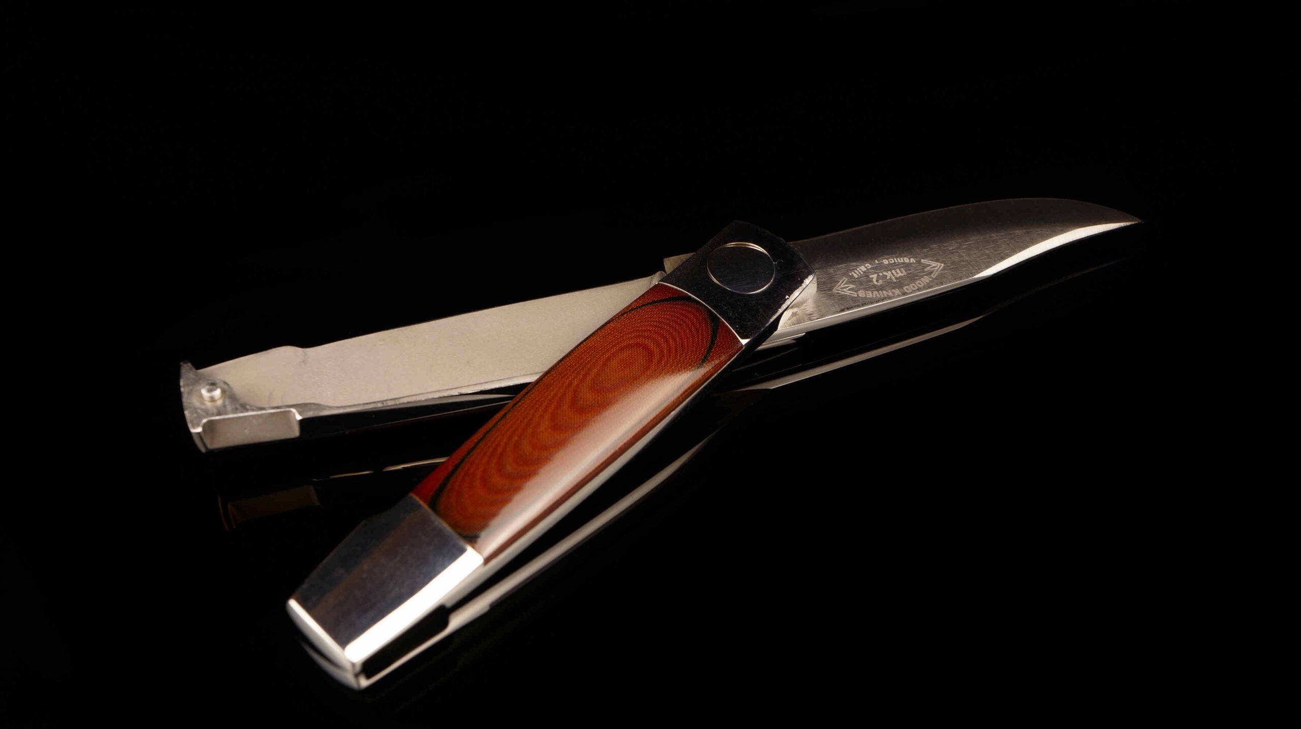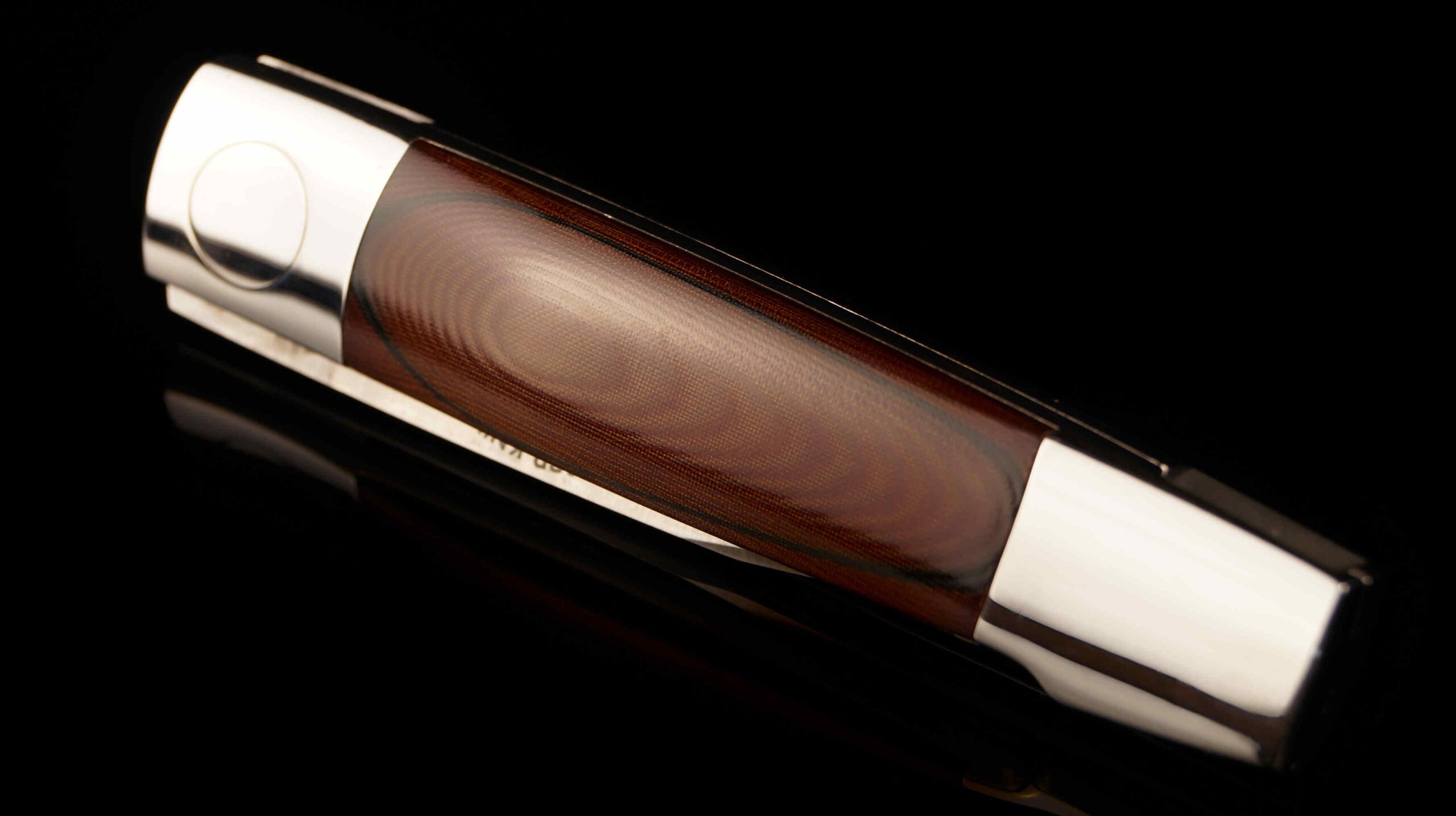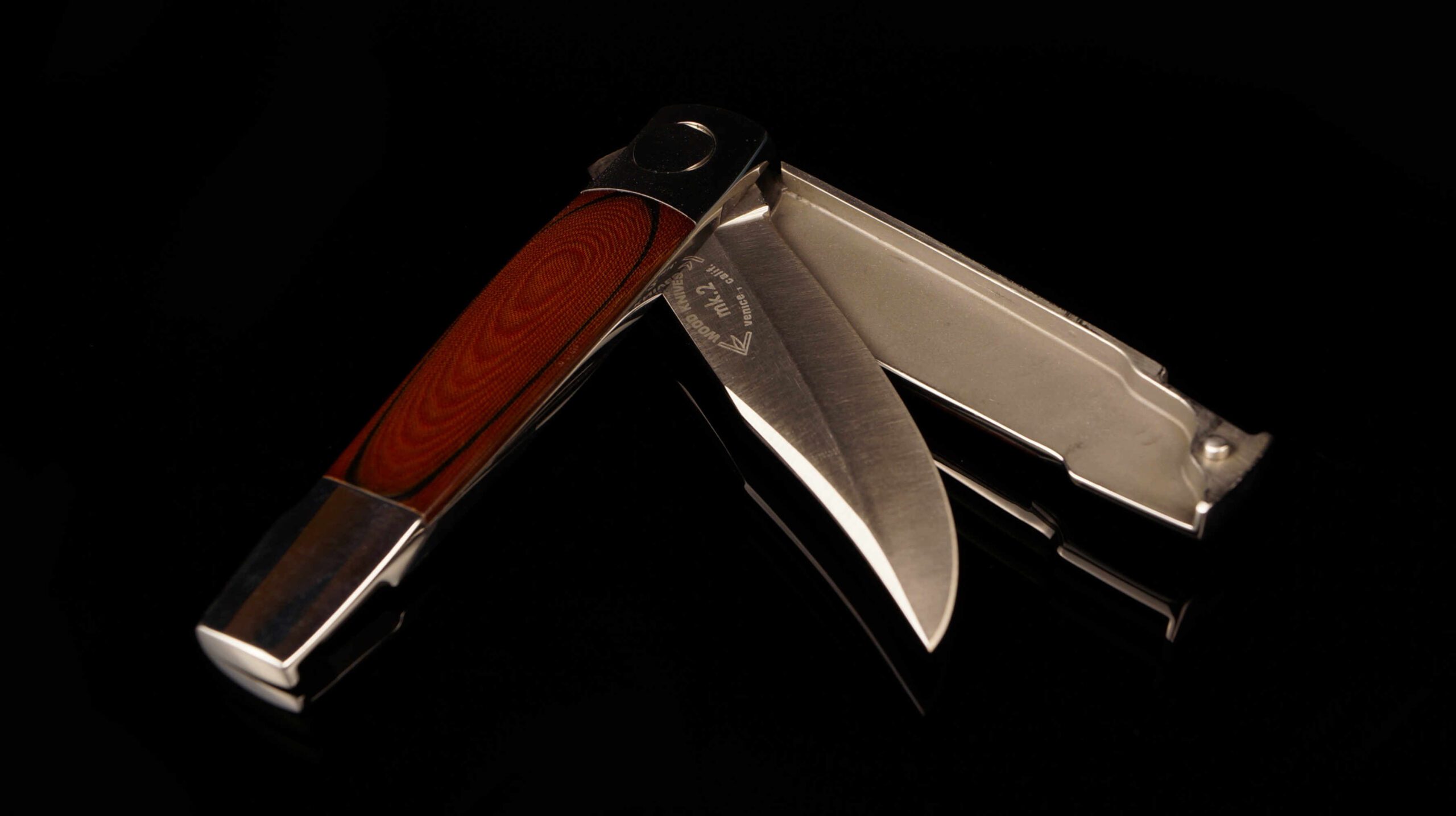 This Barry Wood swing lock folder features a satin finish blade and satin polished stainless steel frame with maroon linen micarta scales. This is a unique scissor opening folder, which when the blade is fully open and locked in place is almost a fixed blade knife. The handle is nicely contoured for a comfortable grip. Opening is accomplished by lightly pressing down and outward at the rear indentation on the spine, which releases the locking pin and allows one side of the handle and the blade to rotate down then forward until the blade locks in the forward position. The one side of the handle continues to rotate back until it locks in place. Closing requires the same slight thumb pressure at the indentation to release the locking pin, then the one side of the handle is rotated back and around, catching the blade and aligning both with the other side of the handle in a locked closed position. Nice function. Has a few light scratches, otherwise excellent condition for age.